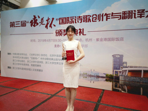4月7日上午,由浙江大学、中美诗歌诗学协会、北京外国语大学外国文学研究所、《世界文学》杂志社、浙江大学出版社等单位共同举办的第三届“求是杯”国际诗歌创作与翻译大赛在杭州紫金港国际酒店举行颁奖典礼。我校澳门电子pg游戏官网2018级俄语专业研究生张颖坤同学以翻译作品《十一月挽歌》荣获全国翻译类二等奖。这是我校俄语专业研究生继第二届“求是杯”获得奖项之后又一次获奖。