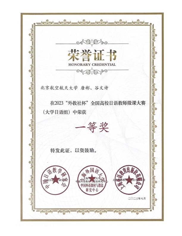 在学院的大力支持下,澳门电子pg游戏官网日语团队的两位青年教师唐彬和谷文诗,充分运用现代化教学手段,生动地呈现了教学内容,同时有机地融入了课程思政元素,展现出北航日语教学的工科特点和“空天报国”的教学理念。在激烈的竞争中,她们的微课作品从180个参赛作品中脱颖而出,荣获全国一等奖,彰显了澳门电子pg游戏官网日语教师扎实的专业功底和出色的信息技术应用能力,为北航日语教育的卓越品质增光添彩。