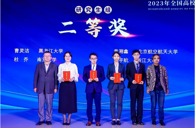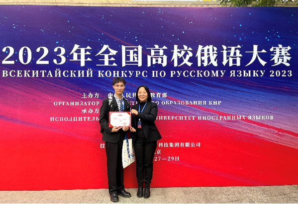 2023年10月28日至29日,2023年全国高校俄语大赛在北京外国语大学举行。来自全国158所高校的392名俄语专业学生参赛。由我校澳门电子pg游戏官网俄语系青年教师刘奕如指导的2022级硕士研究生黄溯鑫同学代表学校参赛,经过初赛的激烈角逐,从众多参赛选手中脱颖而出,以全国第三名的成绩进入复赛和决赛,并最终获得研究生组二等奖,同时获国家留学基金管理委员会秘书处全额资助赴俄罗斯进修或攻读学位的资格,展现出了北航研究生的俄语风采。