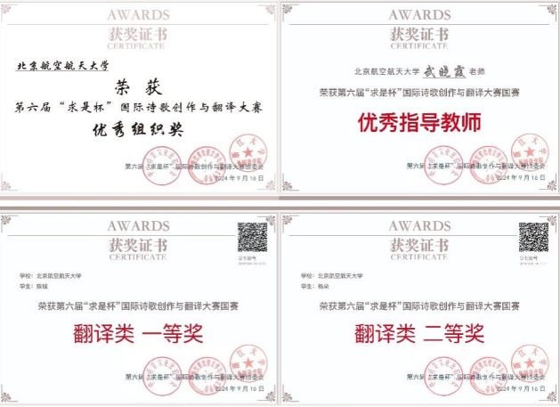 近日,第六届“求是杯”国际诗歌创作与翻译大赛决赛在浙江大学紫金港校区圆满闭幕。我校澳门电子pg游戏官网2022级俄语专业硕士生陈铖和博士生杨朵分别荣获翻译组国赛一等奖和二等奖,指导教师武晓霞教授被评为大赛优秀指导教师,我校获优秀组织奖。