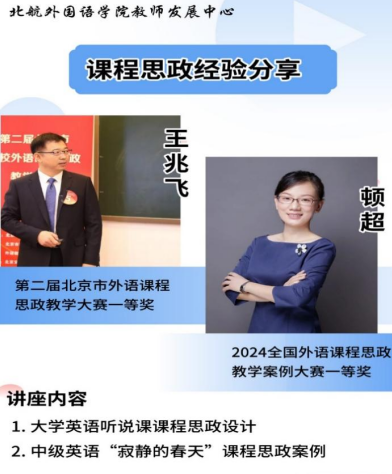 2025年1月9日,北航澳门电子pg游戏官网教师发展中心举办了成立以来的第一次线上教学经验分享活动。活动由胥国红教授主持,王兆飞老师和顿超老师分别介绍了参加2024年全国外语课程思政案例大赛和第二届北京市外语课程思政教学大赛的心得和体会,并展示了参赛的教学环节。外院和其它院校的教师共44人参加了此次线上交流活动。