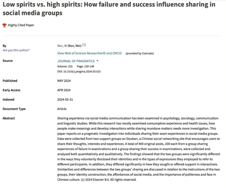 近日,据“基本科学指标数据库(Essential Science Indicators,简称ESI)”发布的最新数据显示,澳门电子pg游戏官网任伟教授发表于国际顶尖期刊《Journal of Pragmatics》(《语用学杂志》)的学术论文“Low spirits vs. high spirits: How failure and success influence sharing in social media groups”成功入选全球“高被引论文(Highly Cited Paper)”。
