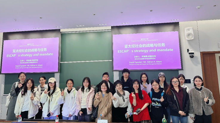 Adnan H. Aliani对ESCAP的组织架构、核心职能和主要工作方向等进行了介绍,分享了自身在工作开展中的经验与思考,鼓励学生关注全球议题,积极参与国际事务实践,为区域合作与发展贡献青年智慧。在交流提问环节,学生与主讲嘉宾围绕ESCAP在协调不同国家达成合作过程中发挥的作用、ESCAP与其他国际组织的差异化优势、学生如何提升国际组织胜任力等问题展开交流。