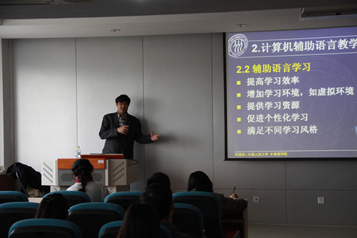 11月10号下午,我院有幸邀请到中国人民大学澳门电子pg游戏官网副院长贾国栋教授进行学术讲座。贾教授的讲座题目为“计算机辅助语言教学的发展、现状及趋势”。在讲座中,贾教授首先简要介绍了计算机辅助语言教学的发展历程,强调几个典型发展阶段及各阶段教学重点。然后重点讲述教学与研究的现状,包括理论基础、教学案例、研究重点及方法等。最后,贾教授根据信息技术的发展对该领域未来主要的发展方向和可能的研究选题作出了展望。