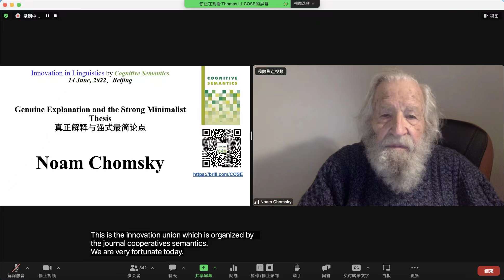 北京时间2022年6月14日早7点至9点,美国历史学家、哲学家和语言学家诺姆·乔姆斯基教授(Prof. Dr. Noam Chomsky)应北航外院英文国际期刊Cognitive Semantics主编李福印教授的邀请,面向近1300名中国和海外学者做线上报告,报告题为Genuine Explanation and the Strong Minimalist Thesis(真正解释与强式最简论点),报告摘要如下:
