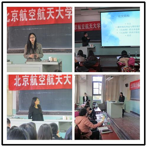 第一位宣讲人黄文静同学以亲身参加的洛阳牡丹节为例,分析总结了公众场合标志的英文翻译错误。紧接着,纪晓娜同学讲述了她的两篇论文,分享了她的学习研究心得。之后,王未默同学从《红楼梦》译本出发,运用多元系统功能理论探讨了翻译策略。王斌同学研究了侦探小说《玉虫缘》译本,论证了“一部作品的译介必然身受特定时代、特定文化中期待规范的影响”。最后,徐萌敏同学从力动态角度分析了中文的致使结构。