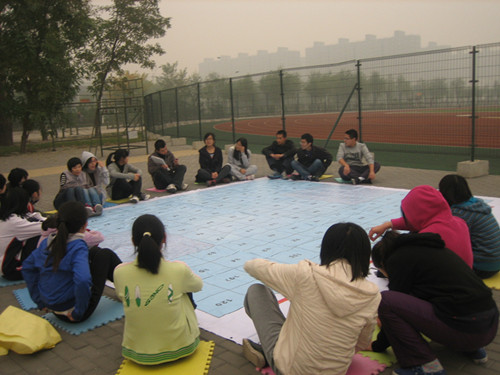 在教练陈帅的组织,辅导员马茜的陪同下,班委们进行了一系列素质拓展活动。首先是“热身活动”:摆出胜利的姿势、互换交替按摩、“警察抓小偷”等游戏。这些破冰游戏无不使活动现场气氛融洽。随后进行的是“雷阵图”活动。大家一致同意从中间开始,进行了一系列的探索,在此期间,舒畅同学进行了记录,虽然看似不惊艳,但其作用却是极大的,这使得大家避免重复进入同一雷区,也使两个小组队长免受惩罚。每个同学都积极思考路线,整个活动过程显得极其有条不紊。大家在这个过程中花了很长时间进行探索,创造力也在活动中得以彰显。虽然最终走出的道路是一条非常简单的直线,但在这过程中,同学们都学会了应该抛弃我们的定势思维,努力拓展一条新道路。而结果也是使人感到非常振奋的,因为我们成为了陈帅教练指导下完成考验最快的小组!