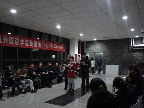 2012年11月23日,由北航澳门电子pg游戏官网学习部主办的本学期第一次英语角活动,在沙河校区教学楼1、2号楼之间的5层走廊举行。此次英语角是北航外语文化月系列活动之一。参与此次活动的有学习部的全体成员,外教Jeremy,报名英语会员的同学,外交学院sica的部分成员,总人数将近70人,规模较大。