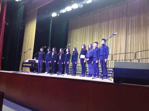 从得到通知到上台比赛,只有半个月的准备时间,在忙碌的大三大四群体中临时组建起来一只合唱队伍不是一件容易的事情。最后来自大三的王帆、王玥、王婉仪及来自大四的王君、孟庆宜、舒畅、洪懿、刘博、刘方哲、邓嘉梁十名同学组成了外院小合唱队伍,承担起了这个任务。在半个月的时间里大家从定曲目、定声部、定装扮,有商有量,团结一心,克服排练时间和排练场地的困难,进行了三次排练,从第一次排练的不成形到最后在台上的出色表现,大家可谓是进步巨大,付出值得肯定。外院小合唱的队伍并不像其他队伍一样拥有声乐特长生,或者是来自飞天这样的专业院系合唱团,大家都只是音乐爱好者,有的同学并没有合唱经验,但通过这段时间以来互帮互助的努力,最后呈现出了精彩的《Memory》,大家可谓是拼尽全力,给观众和评委老师们呈现出了最好的自己,敢说我们的表现并不比专业队伍逊色多少。这样的成绩当然也少不了排练期间几位校合唱团同学的指导和一直以来非常给力的来自二系大三的钢琴伴奏外援陈广同学,在这里对他们表示感谢。