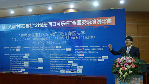 2012年12月30日第十八届中国日报社“21世纪·可口可乐杯”全国英语演讲比赛京津地区决赛在中央民族大学举行。我校选送的两位参赛者向为(学号11051123)和郭鸿涛(学号11041171)均获得一等奖,其中郭鸿涛获得本次大赛的季军,直接入围2013年3月举办的全国总决赛。